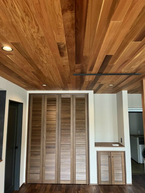 そして、リビングを囲む4つの壁は柿渋が入った漆喰の上をいく、どのぬり壁よりも多機能で抗菌、有害物質の除去、調湿性能も高く常に空気をきれいにする、柿ウオールと言う塗り壁材で、重厚感のある風合いを出しリビングをワンランク上の空間に見せることに成功させています。